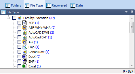 The File Type view sorts files by extension. This view shows all files on the examined drive. Select a file type, and then look for the deleted file icons. It is also helpful to sort by the “Is Deleted” column in this view.