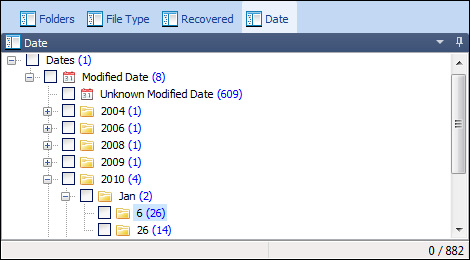 The date view groups files by date. This view shows all files on the examined drive. Look for the deleted file and folder icons.